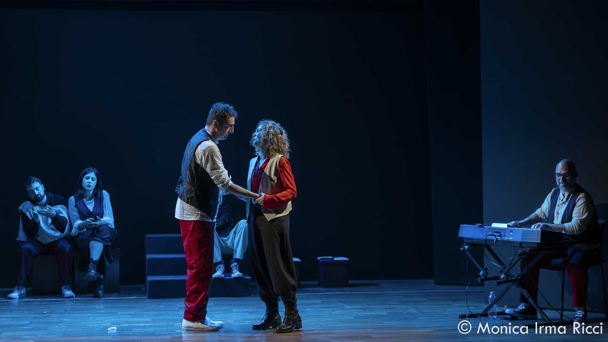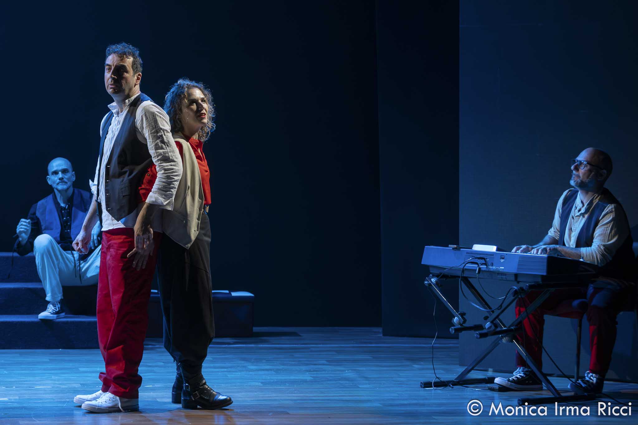 Il palcoscenico diventa di volta in volta lo studio di tatuatori (che ricordano in potenza, per l’atteggiamento nei confronti dei dolori che impongono ai clienti, il sadico dentista della piccola bottega degli orrori ) per trasformarsi in studio psichiatrico ed in osteria, per poi divenire il greto di un fiume dove due protagonisti, insoddisfatti della loro condizione, riescono ad aprirsi l’un l’altro dichiarando uno la propria idiosincrasia verso gli aghi e l’altra l’amore che prova verso di lui.